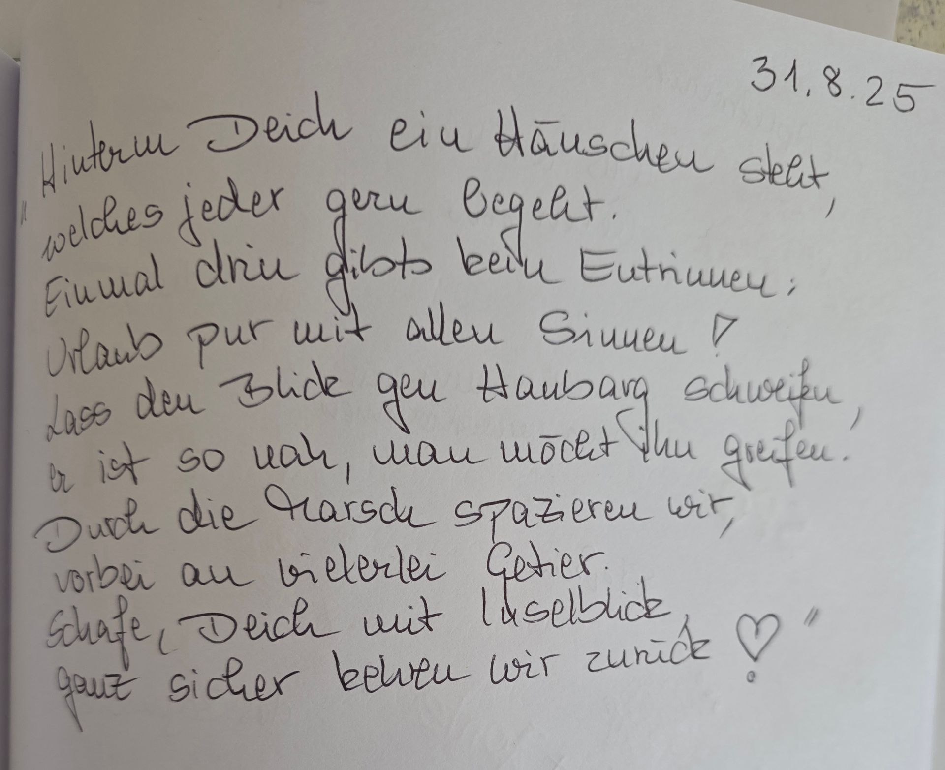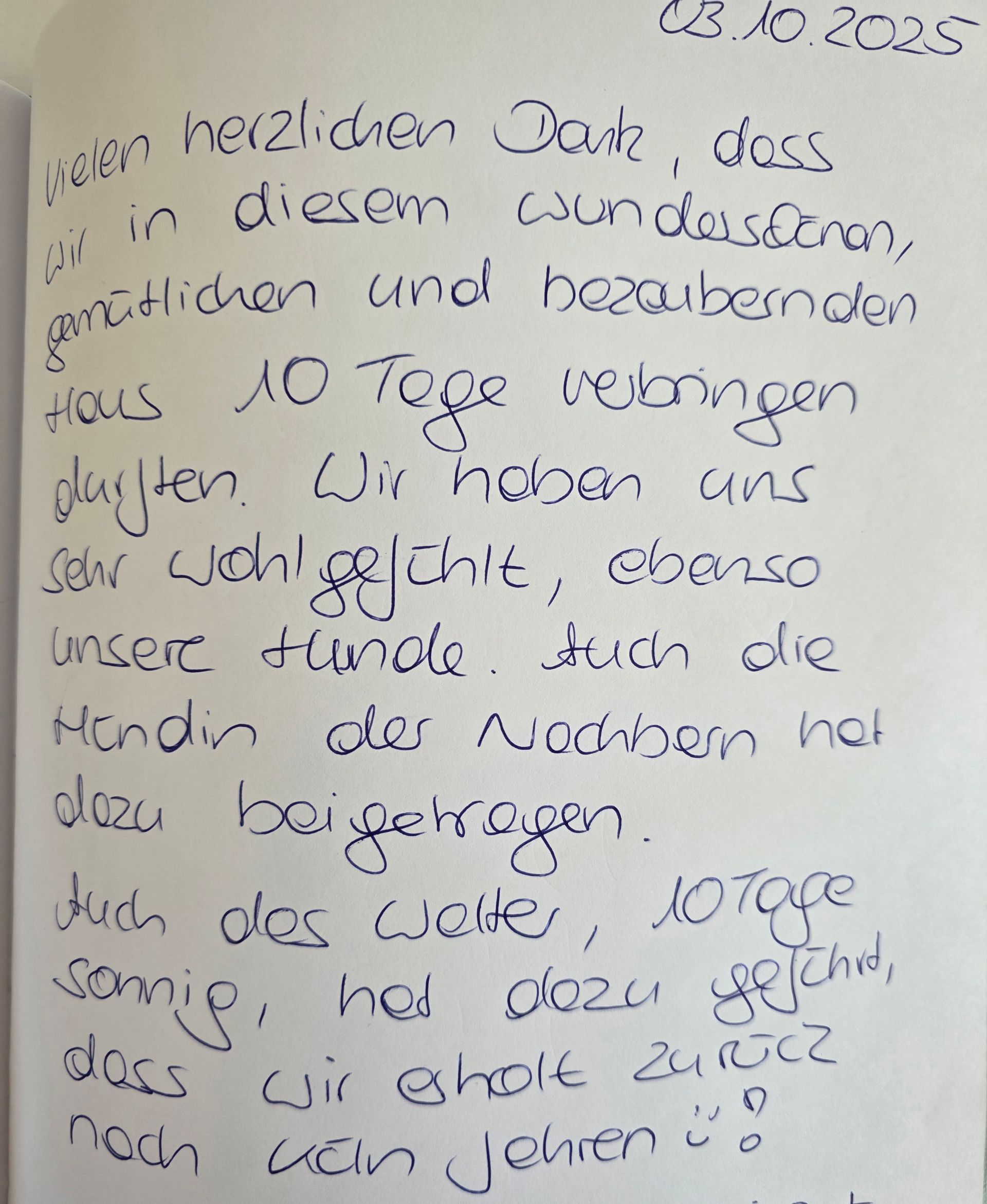 Worte mit Herz – das sagen unsere Gäste. Hier teilen unsere Gäste ihre schönsten Erinnerungen, persönlichen Eindrücke und kleinen Glücksmomente, die sie im Haubarg-Kieker erlebt haben. Ob liebevolle Worte, spontane Gedanken oder einfach ein herzliches Dankeschön – jeder Eintrag erzählt ein Stück Urlaubsgeschichte.